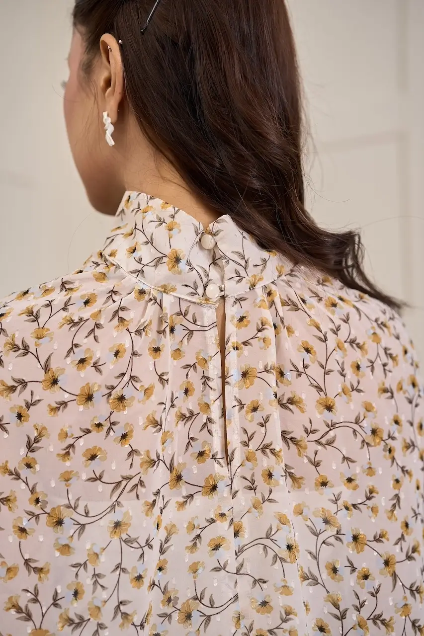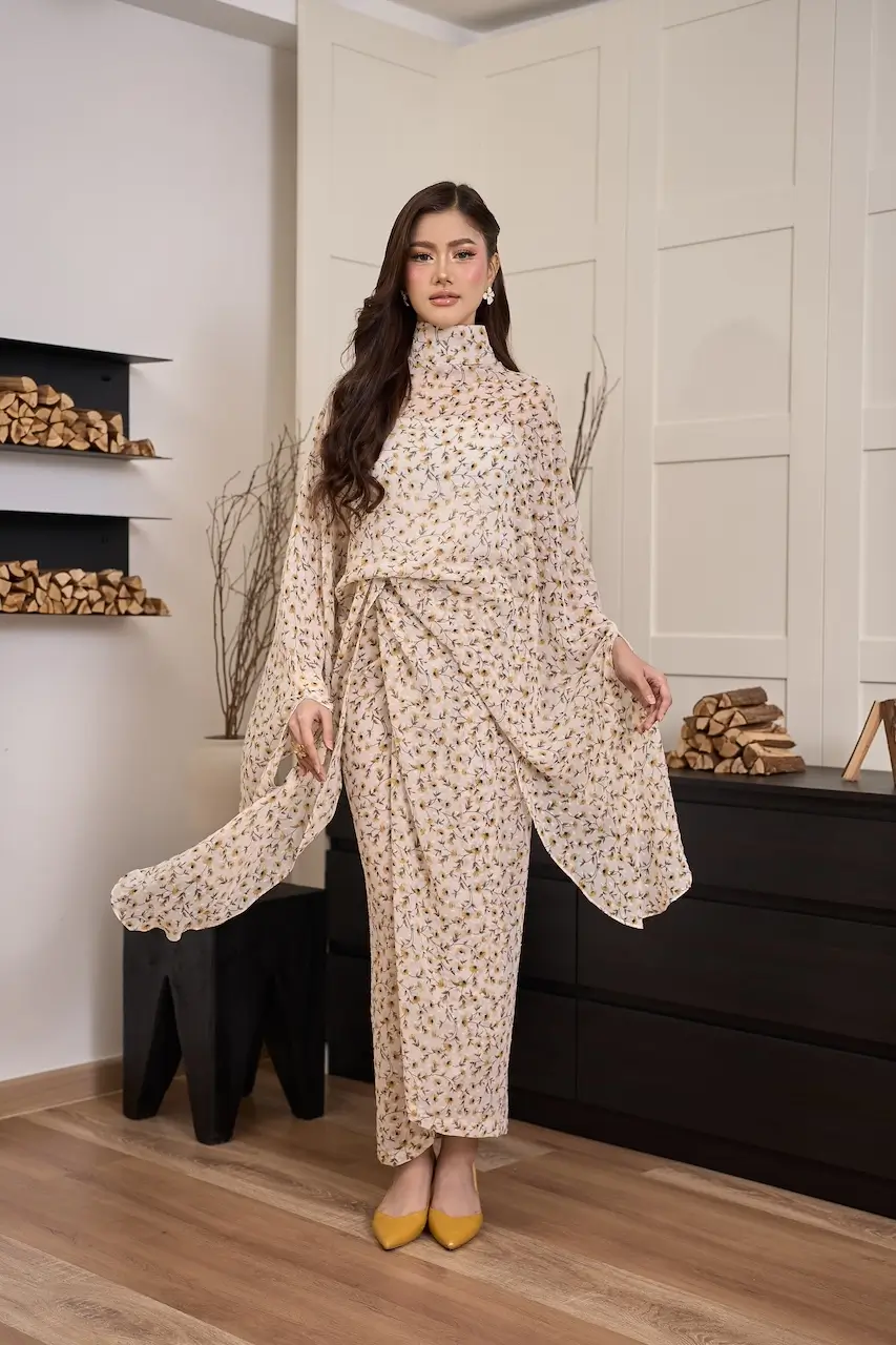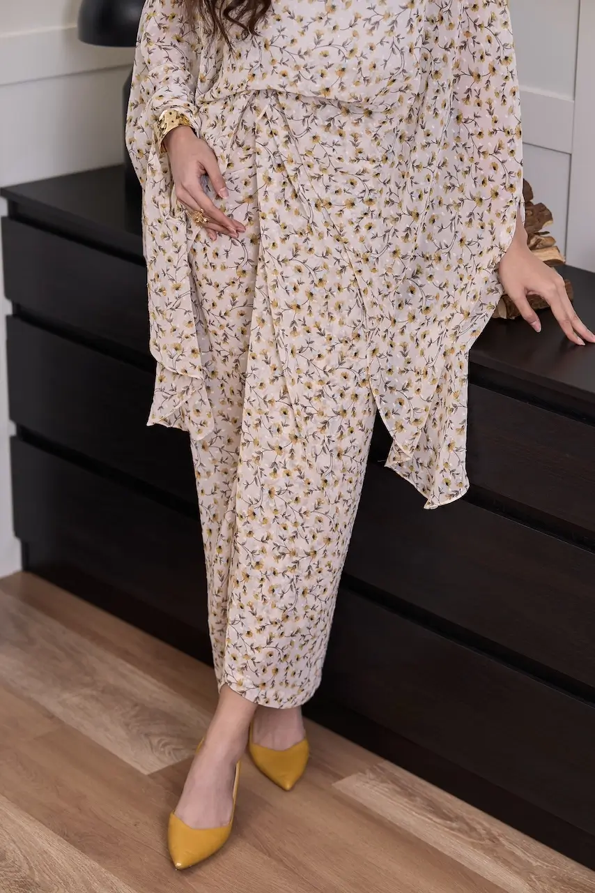 BIDADARI Kaftan is a poetic expression of femininity and freedom. Crafted from ironless printed georgette chiffon, the fabric is feather-light, breathable, and effortlessly fluid — designed to move beautifully with every step.