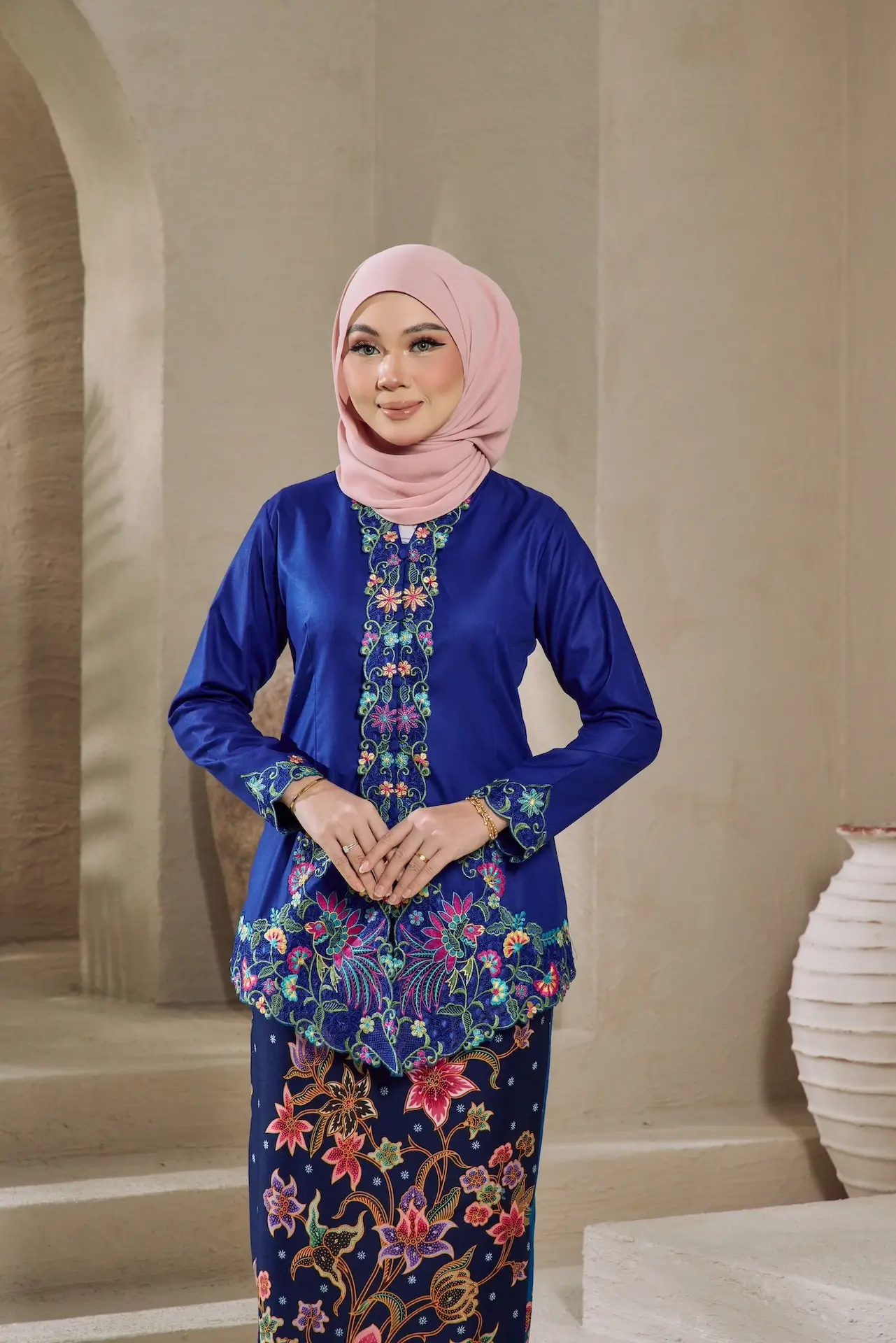 Kebaya Seroja is a traditional women’s attire with sulam (embroidery) patterns, tailored with custom detailing attach with “kipas” batik skirt .