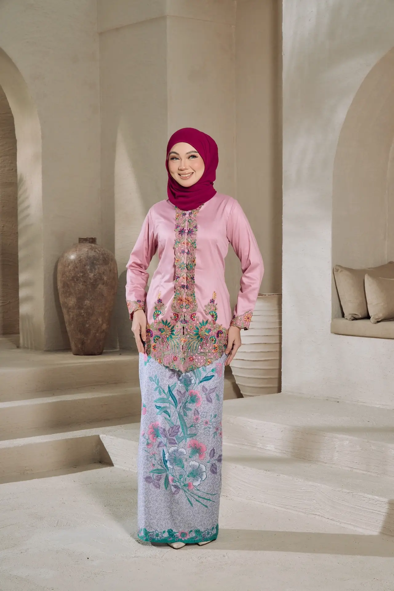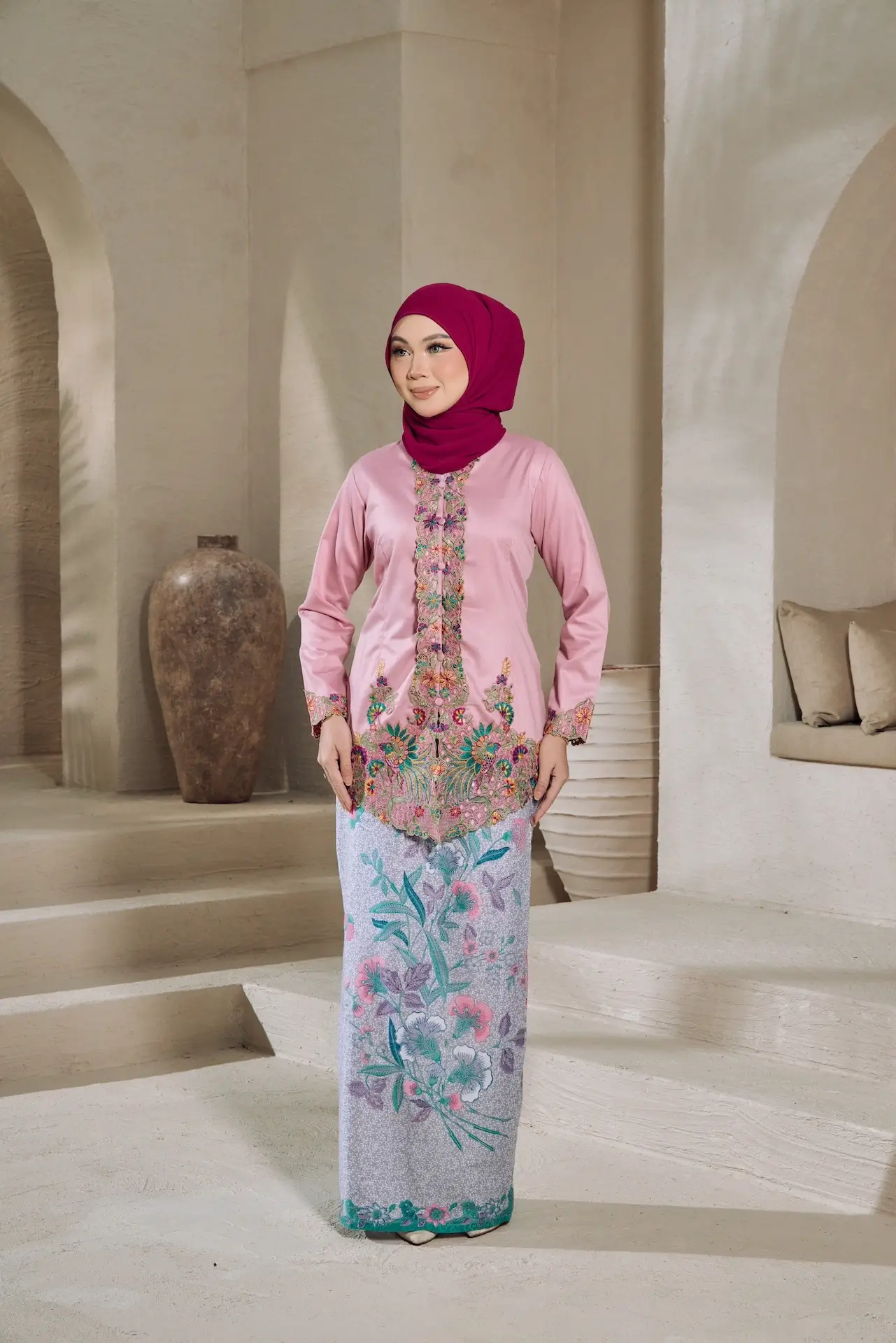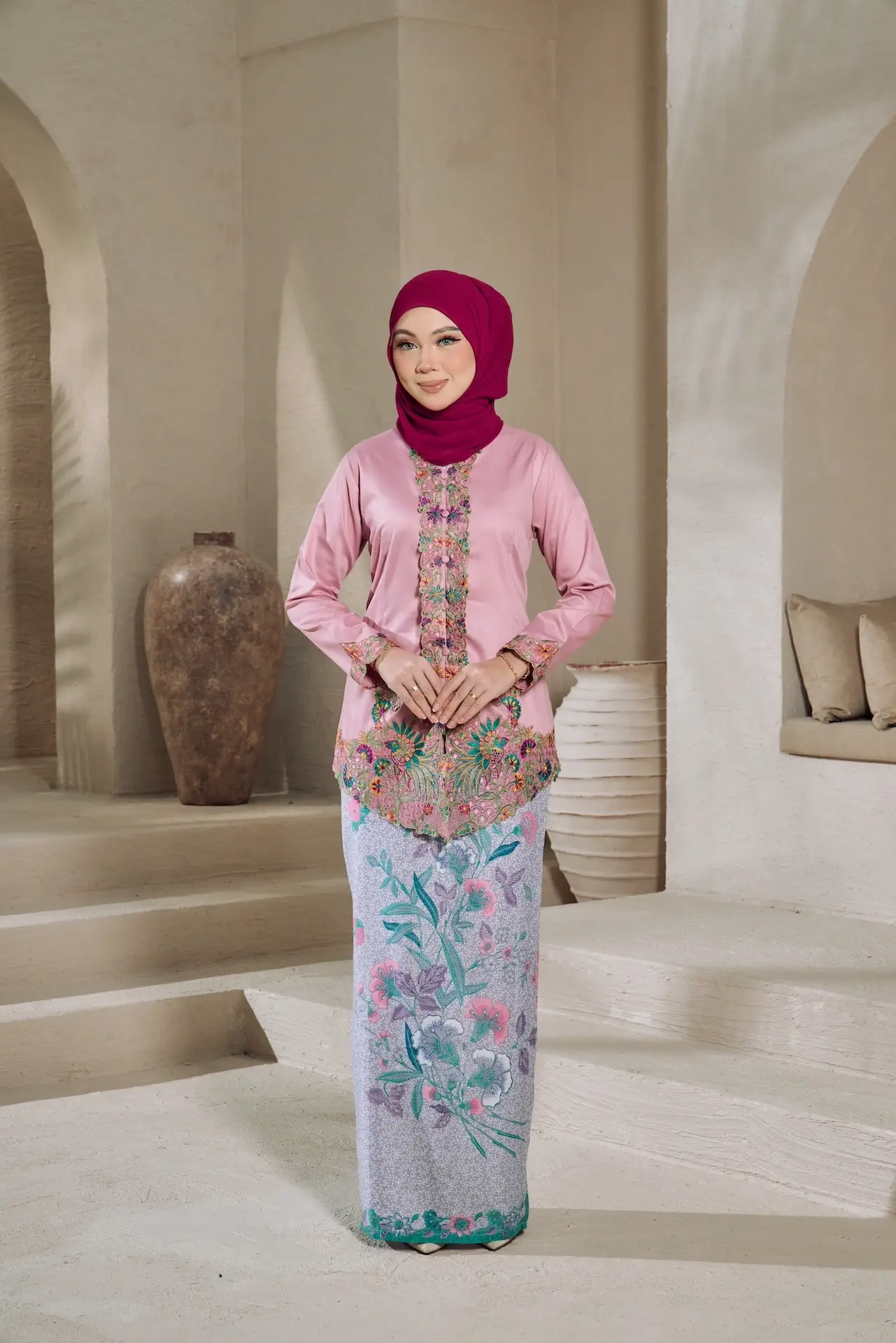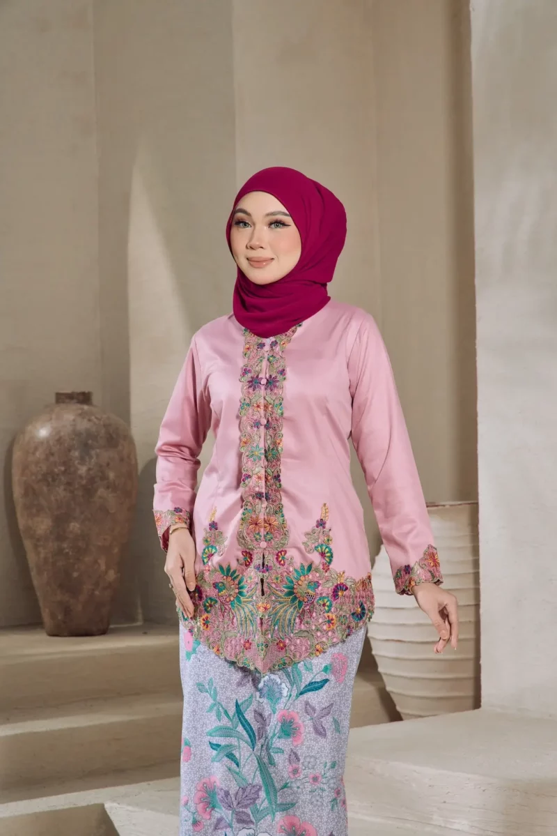 Kebaya Seroja is a traditional women’s attire with sulam (embroidery) patterns, tailored with custom detailing attach with “kipas” batik skirt .