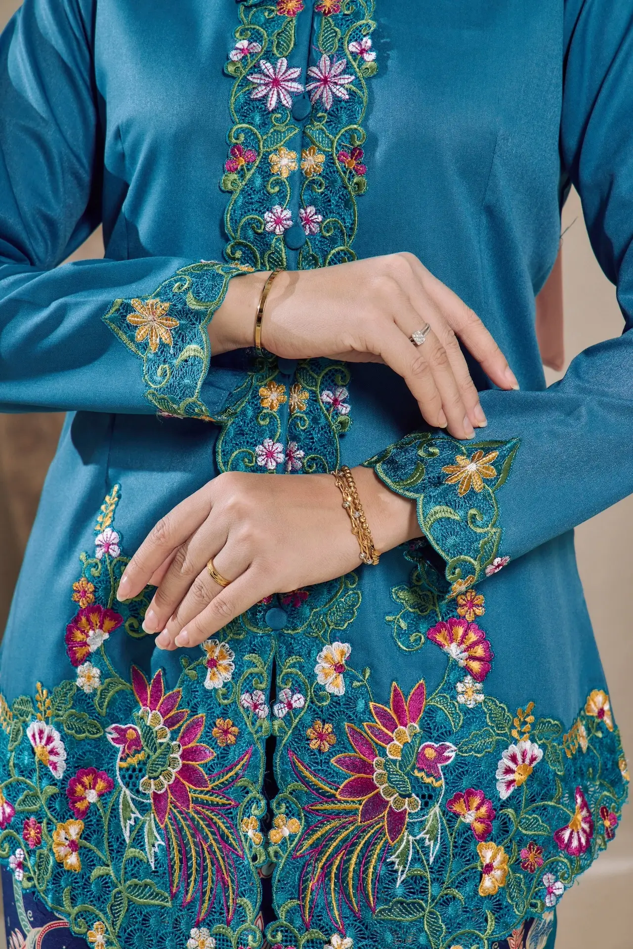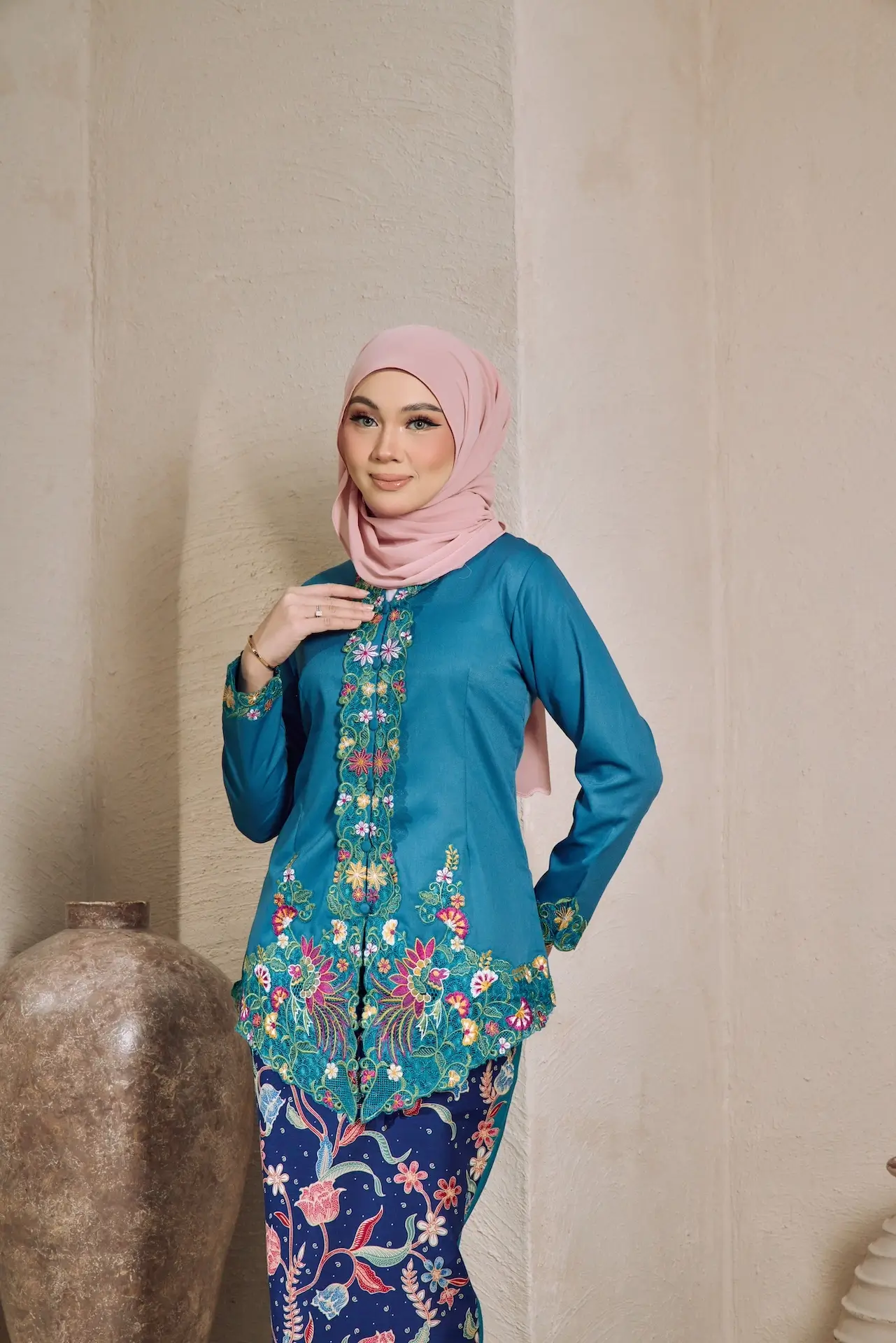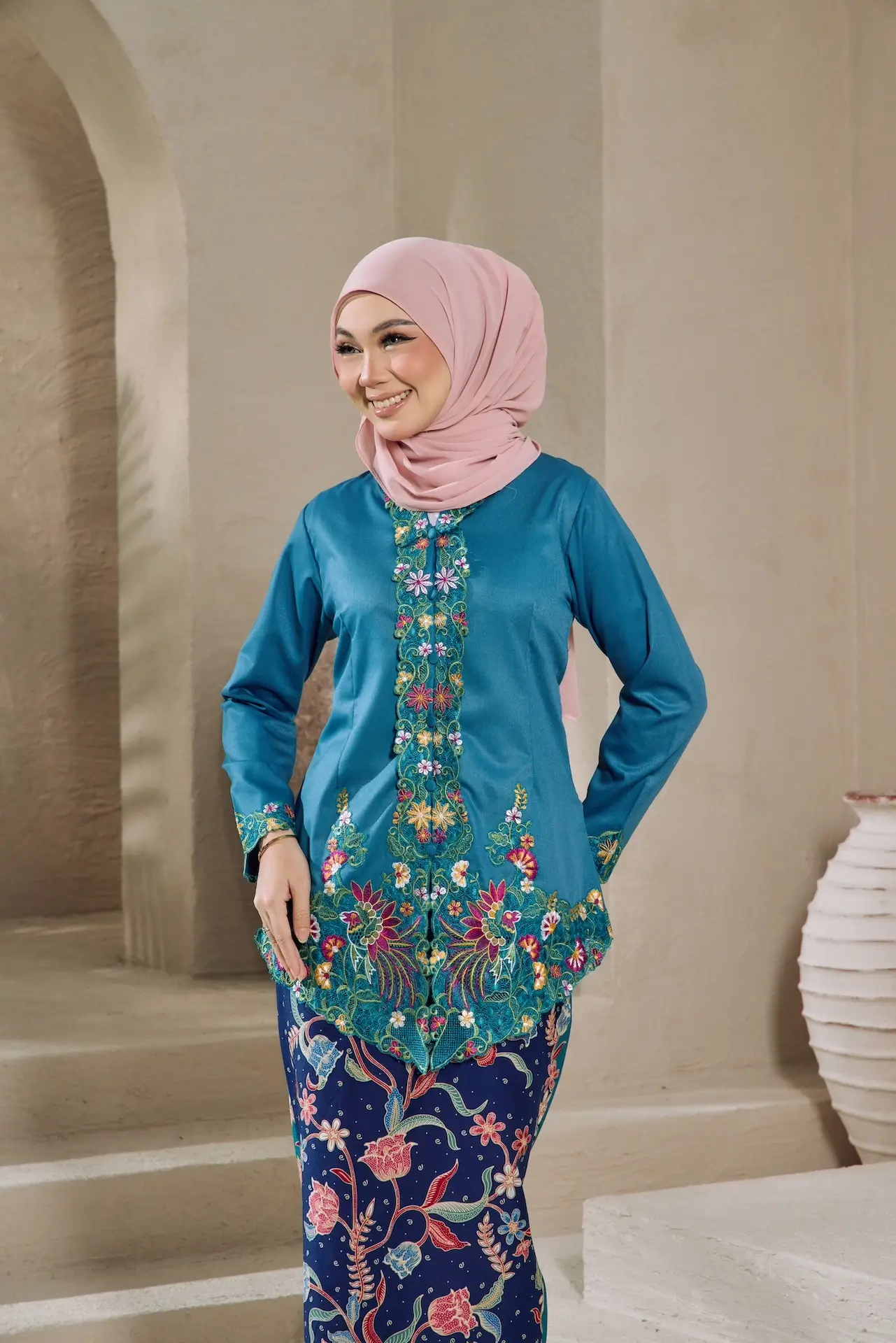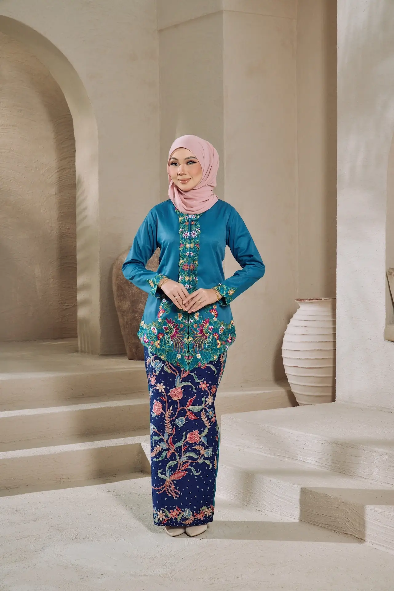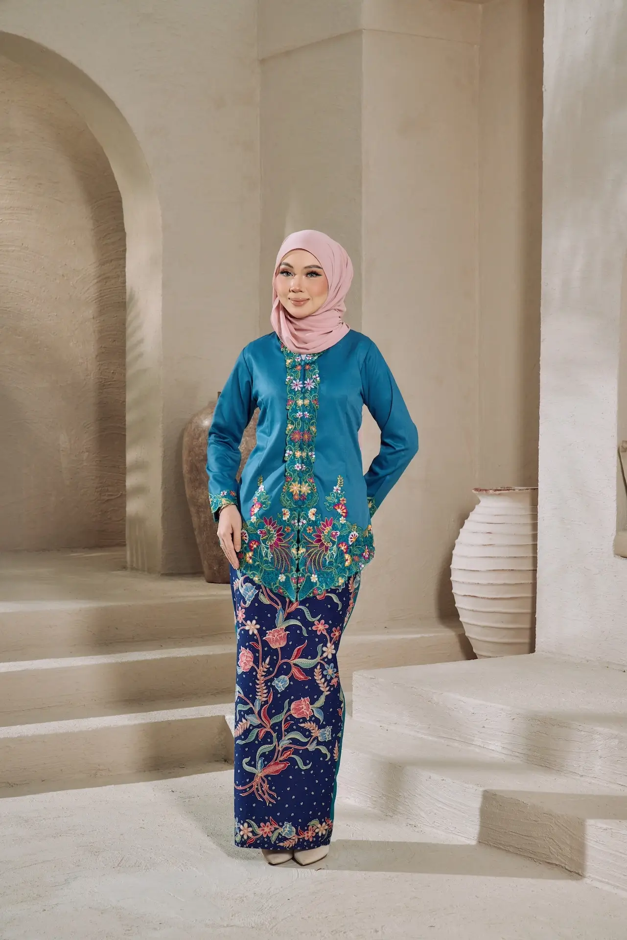 Kebaya Seroja is a traditional women’s attire with sulam (embroidery) patterns, tailored with custom detailing attach with “kipas” batik skirt .