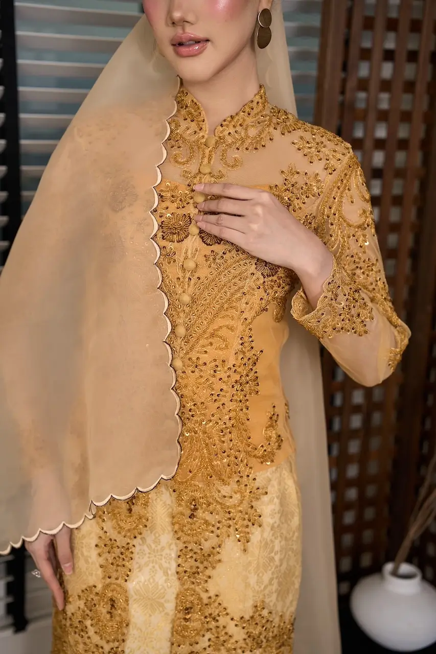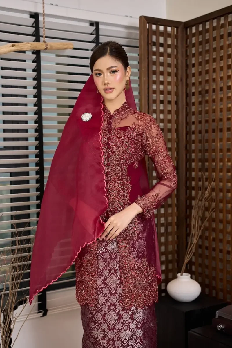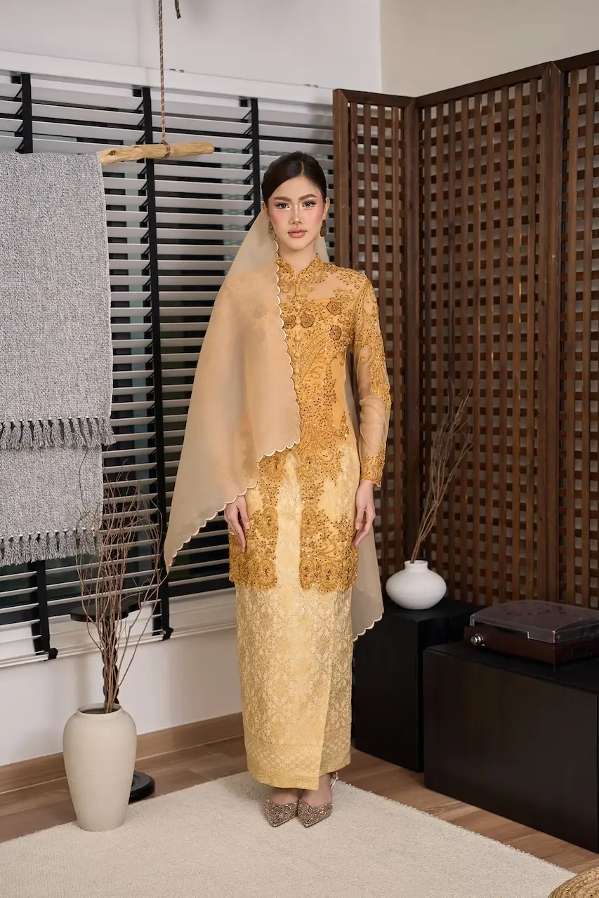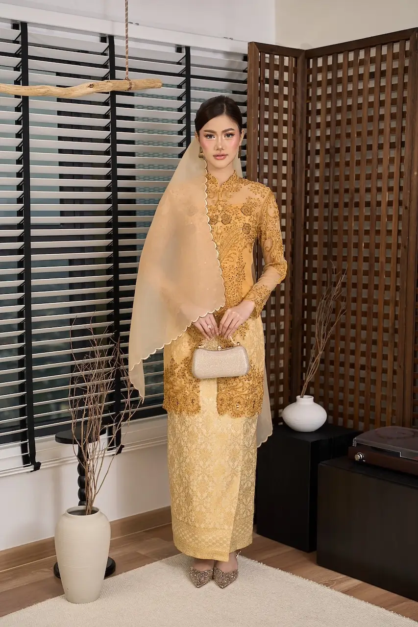 Paired with an instant songket skirt, this set offers effortless elegance for meaningful Raya moments and cherished celebrations. Completing the ensemble, Ratna Kebaya Set comes with a FREE corset tube and an embroidered organza shawl, thoughtfully curated to elevate the look into a truly complete statement of luxury.