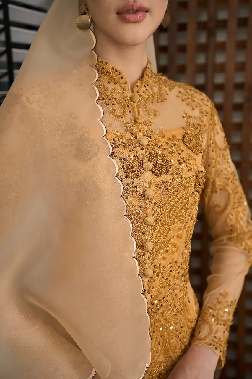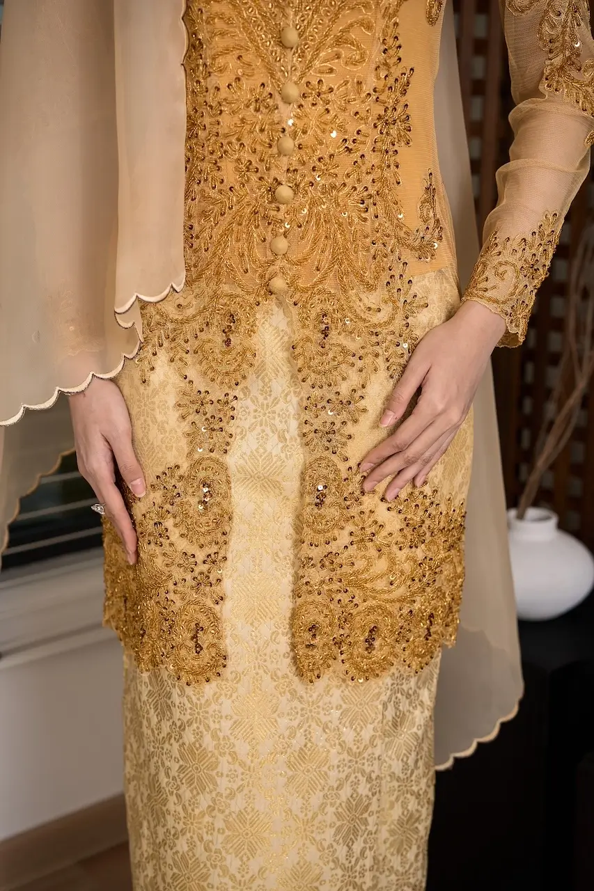 RATNA ÉXCLUSIVÉ KEBAYA is crafted for the woman who carries grace with strength — refined, poised, and effortlessly elegant. Designed in soft net fabric, the kebaya is adorned with full handmade beading, creating a delicate shimmer that catches the light with every movement, whispering sophistication rather than demanding attention.